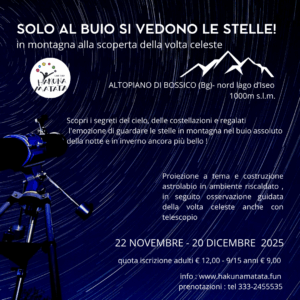 Non perdere l’occasione di partecipare ad una serata sotto il cielo stellato dell’altopiano di Bossico (Bg) a 1000m s.l.m. a nord del lago d’Iseo.