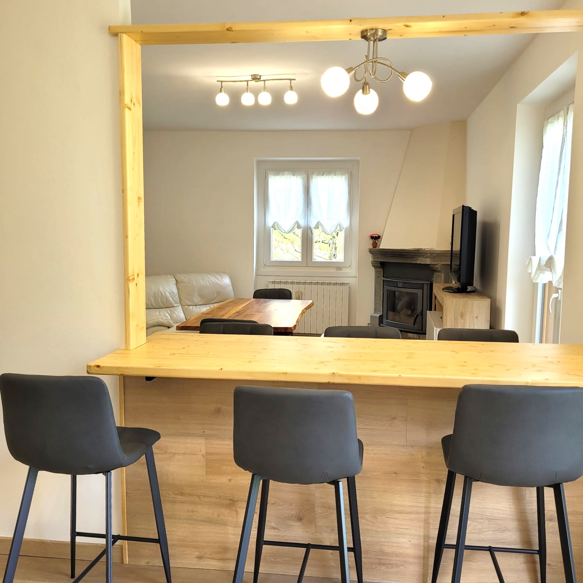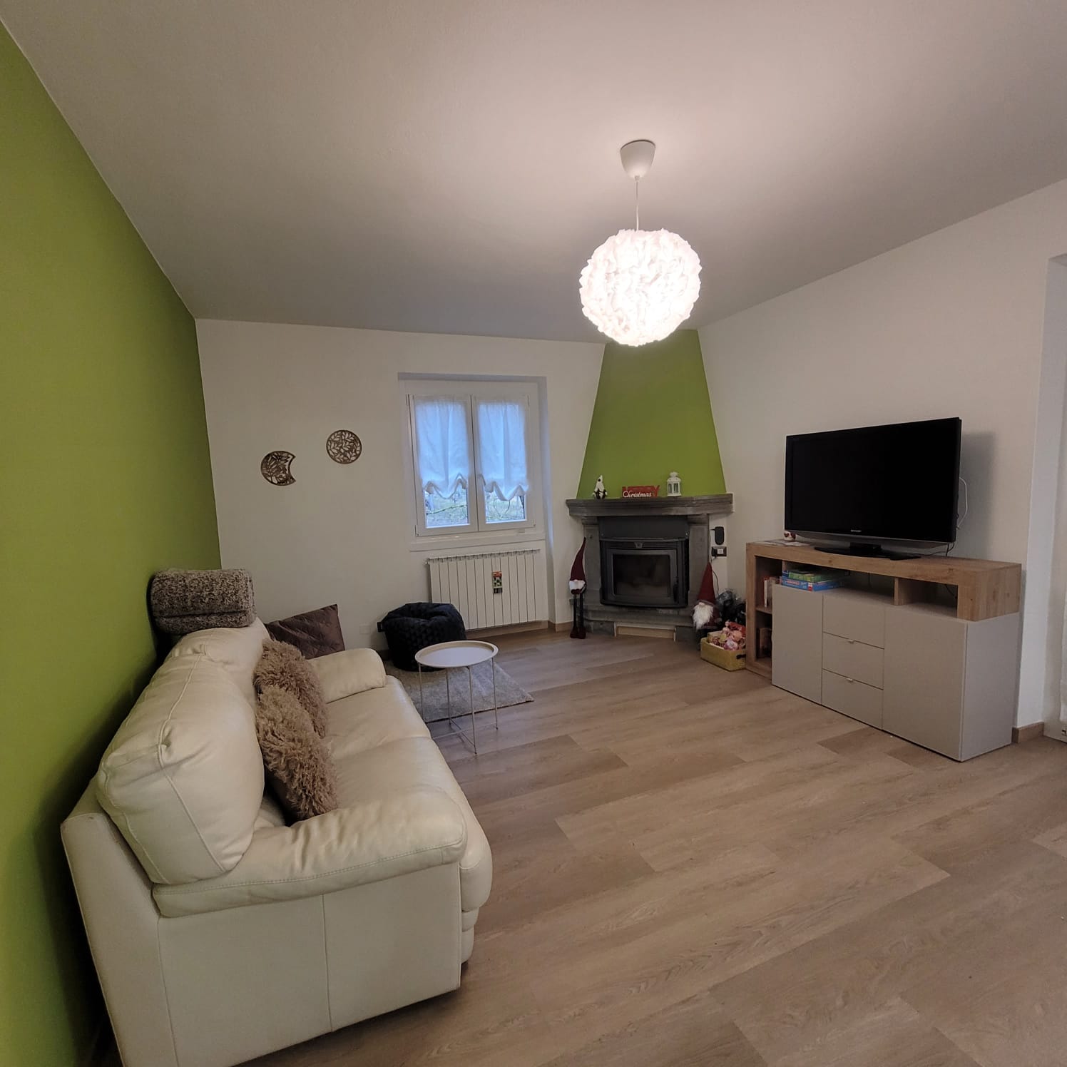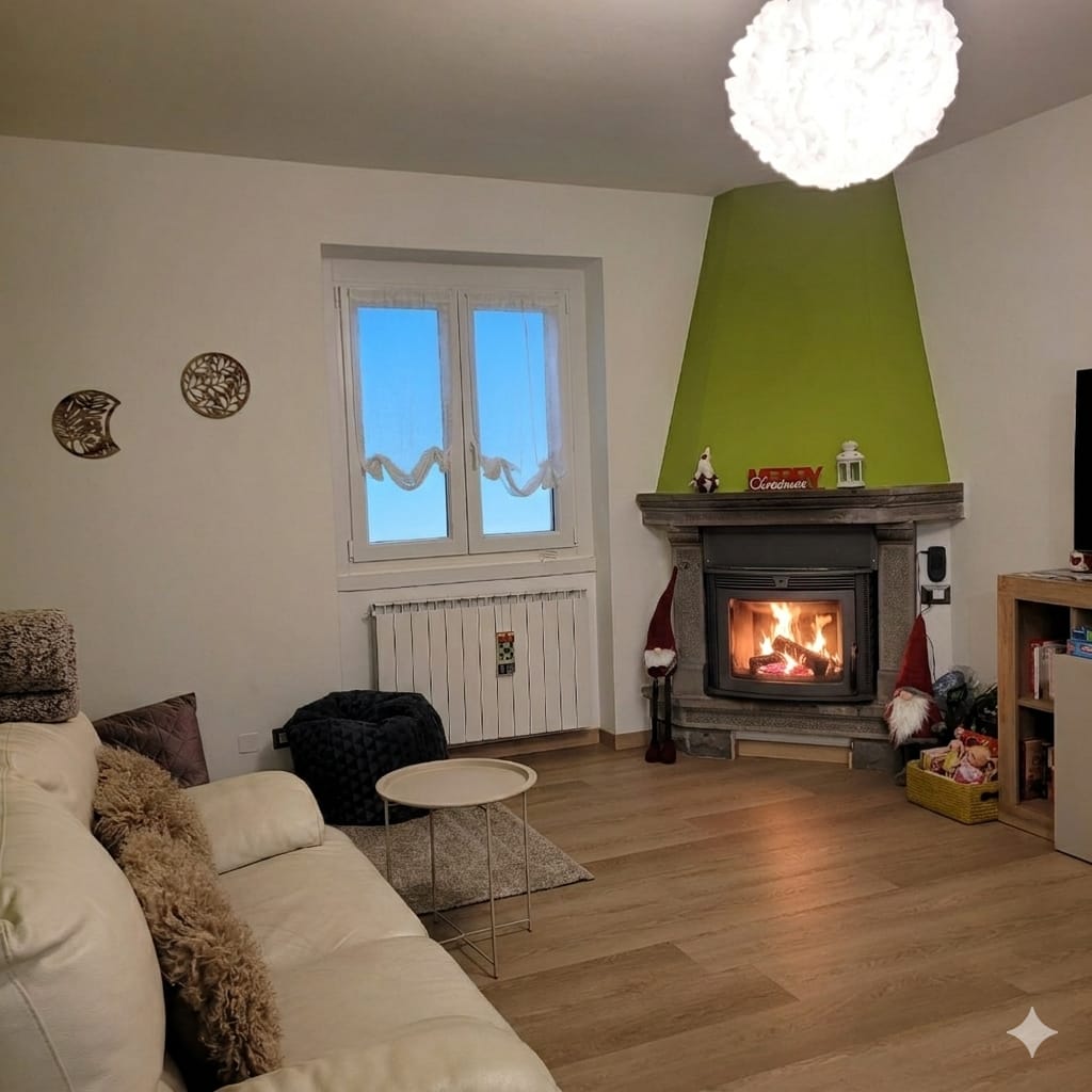 – Zona salotto con caminetto a pellet, divano e televisore