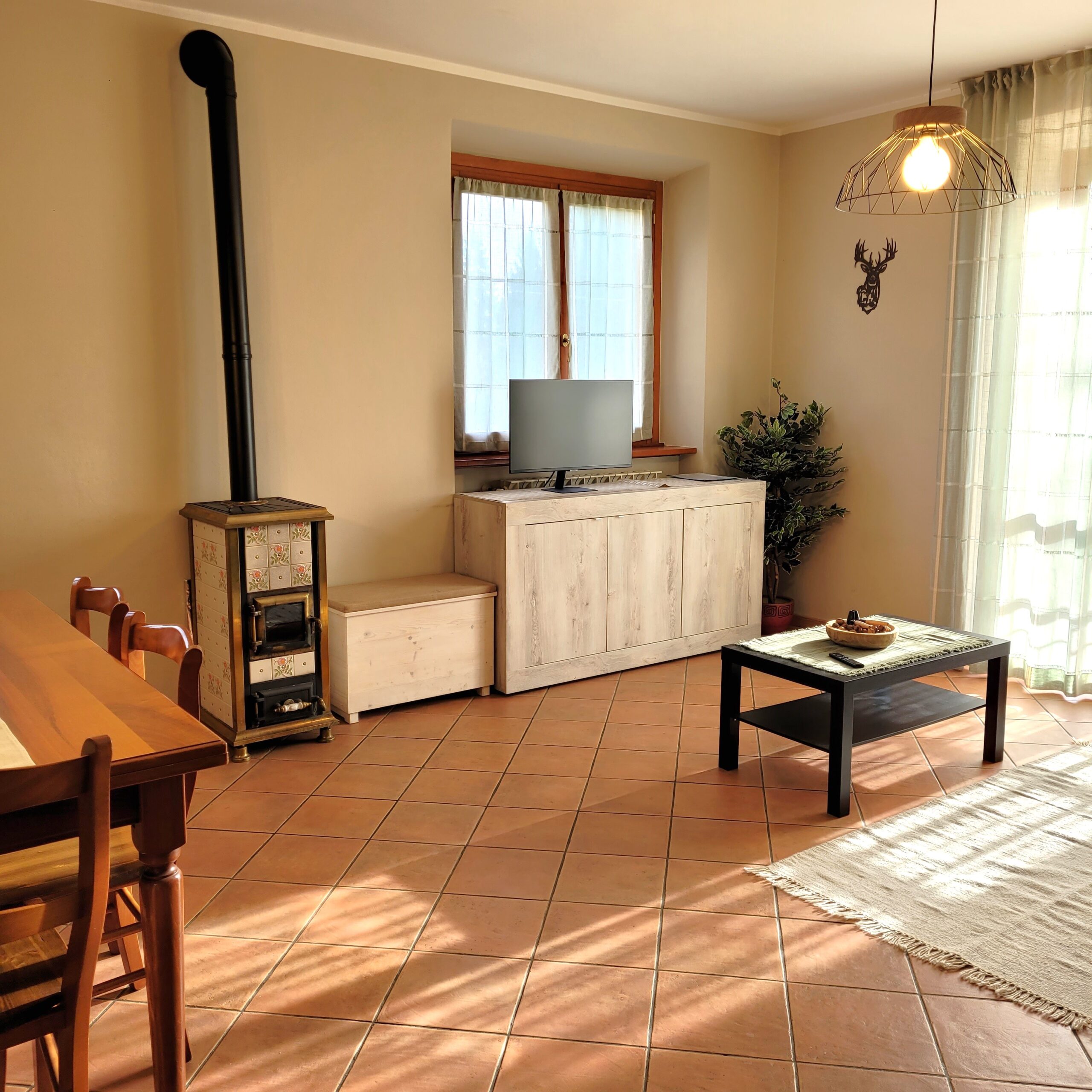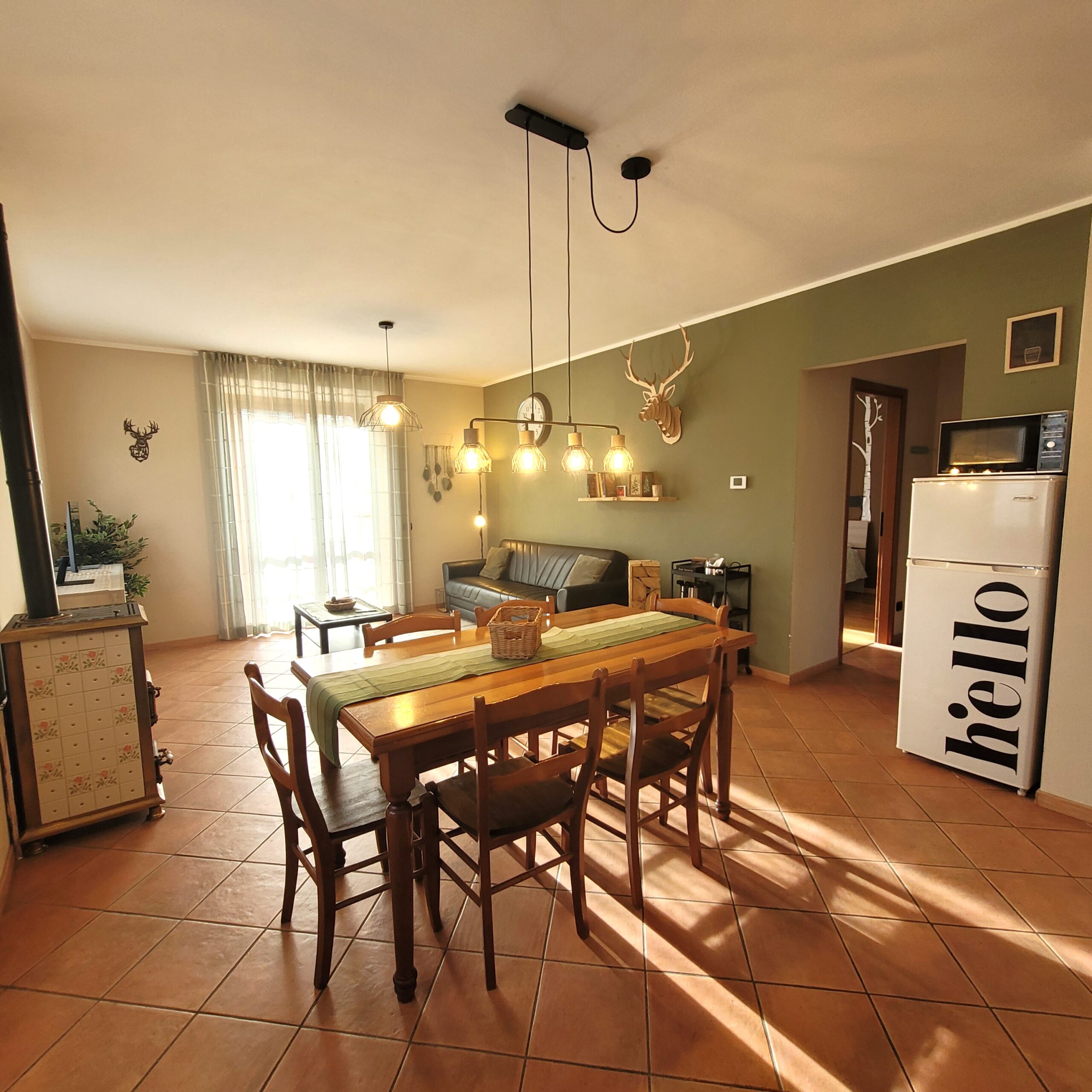 – Open space zona giorno con cucina attrezzata, tavolo e sedie, zona salotto con divano, smart monitor con servizio Netflix gratuito e wifi, stufa a legna oltre che riscaldamento autonomo con caloriferi.